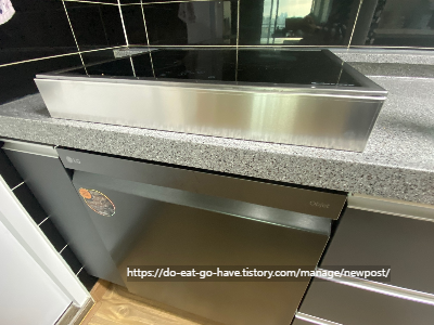 ▷식기세척기 설치 전에 설치기사님이 방문해 주셨는데 인덕션이 매립형이라 프레임이 있어야 한다고 하셔서 며칠 뒤에 다시 배장문 하셔서 설치를 해주셨다. 식기세척기를 설치함에는 상관이 없지만 이를 사용할 때 식기세척기는 자체열을 발생하기에 큰 문제가 되지 않지만 인덕션이 작동하면서 열을 배출하지 못하면 인덕션에 문제가 생기기에 열을 뺄 수 있는 무언가가 필요하다고 하셨다.