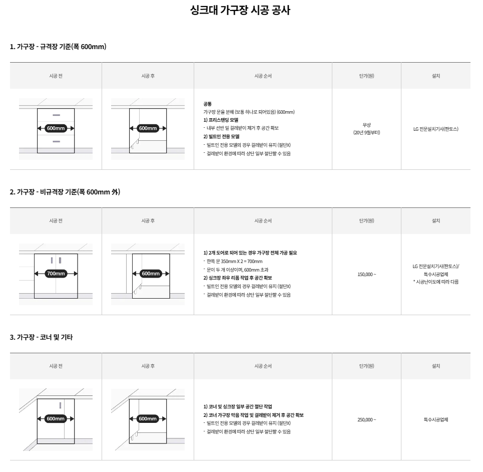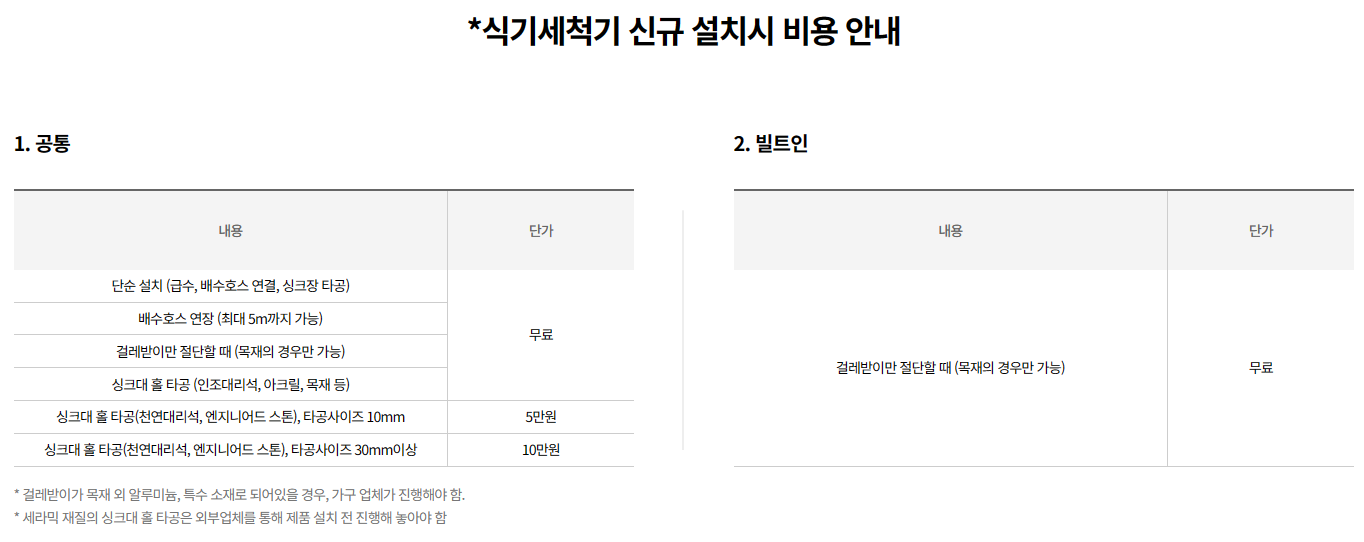 설치 시 하부장이 규격에 맞고, 싱크대가 인조대리석, 아크릴, 목재 등 일반적인 상판이라면 설치비용이 무료이지만 상판이 특수상판이거나 하부장이 규격에 맞지 않는다면 추가비용이 발생할 수도 있다.